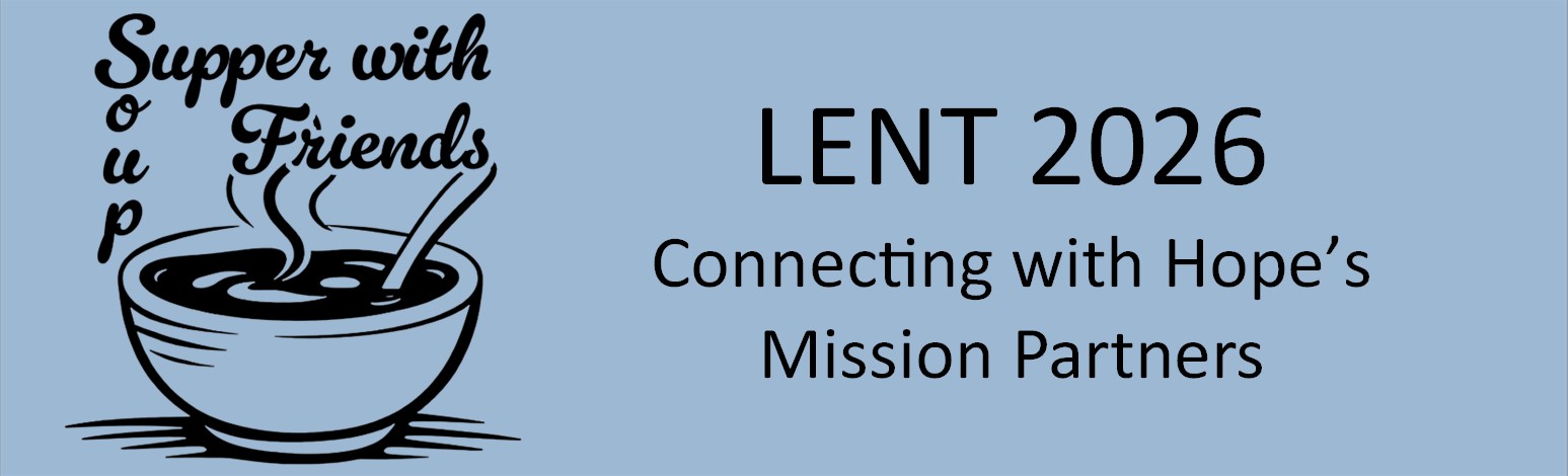 February 18 is Ash Wednesday and will be followed by a worship service at 6:30 pm. The other 5 dates for the soup suppers will be followed by a guest speaker from one of our mission partners.